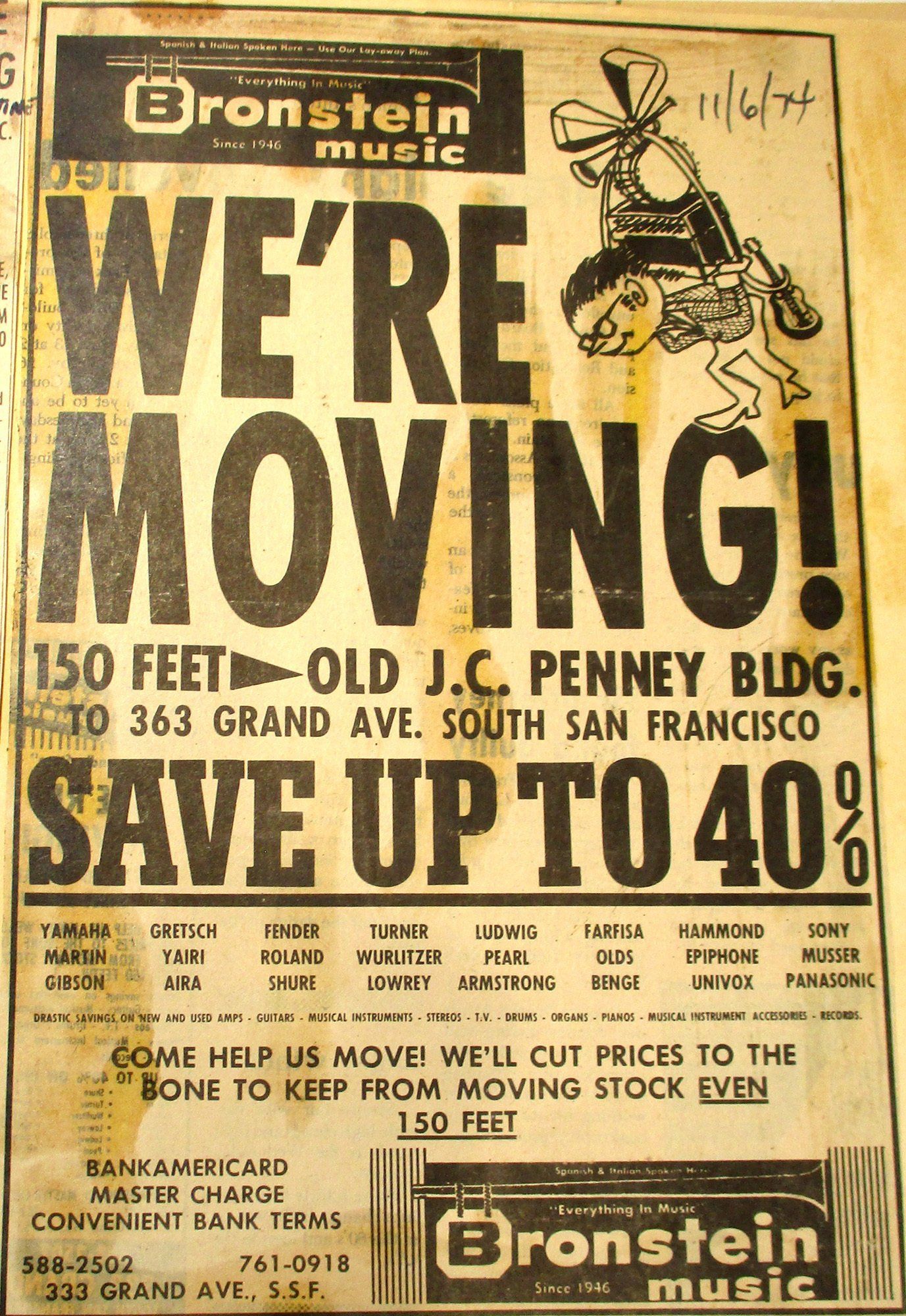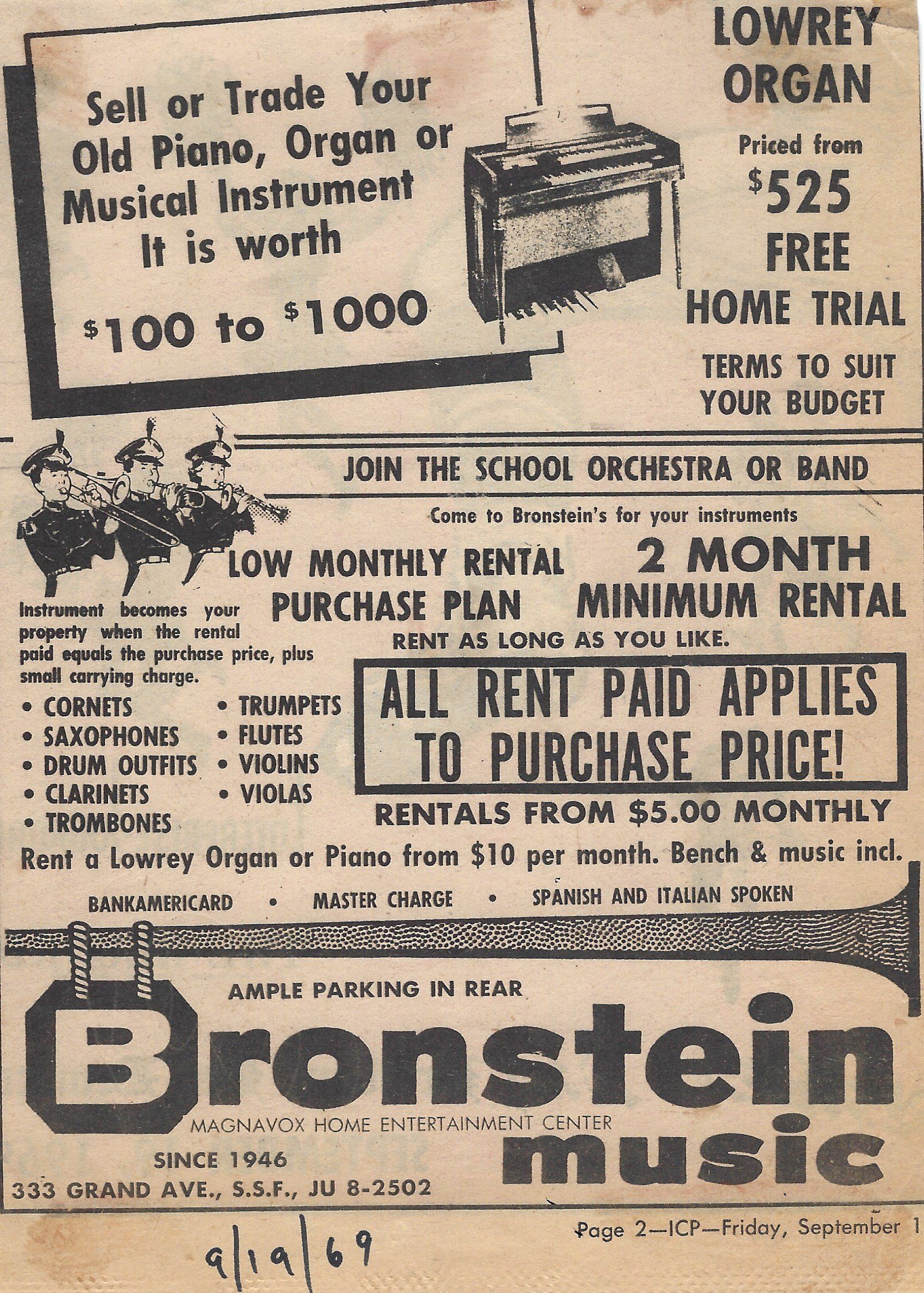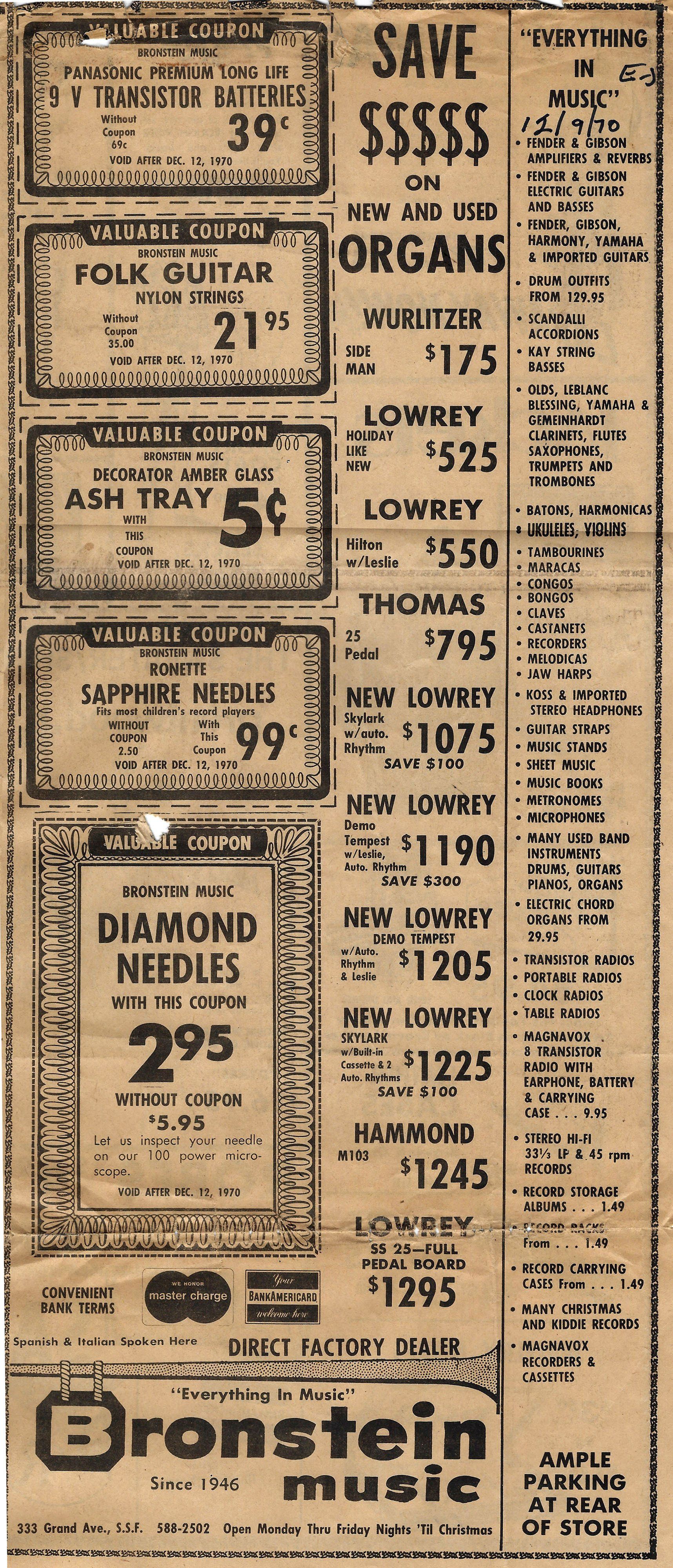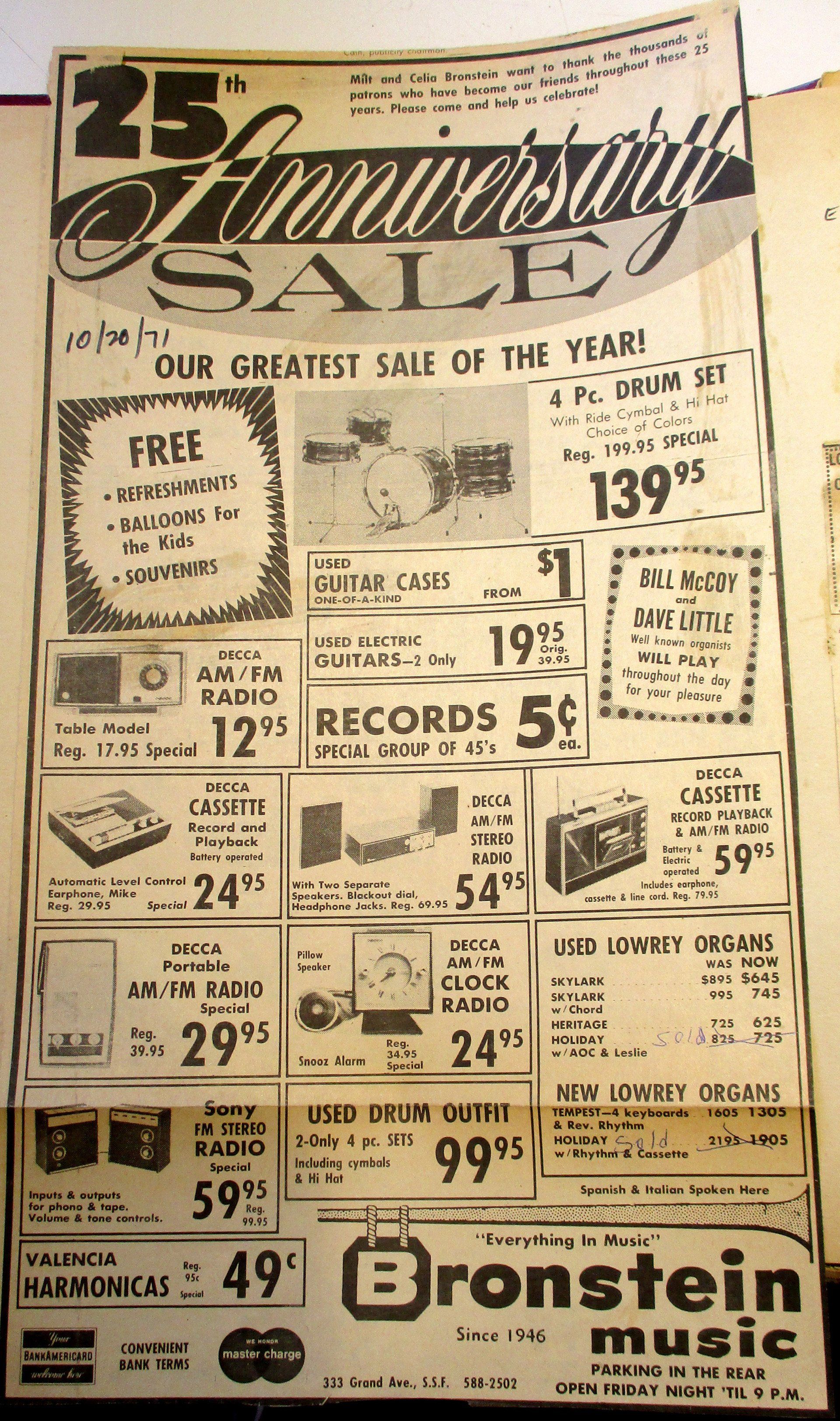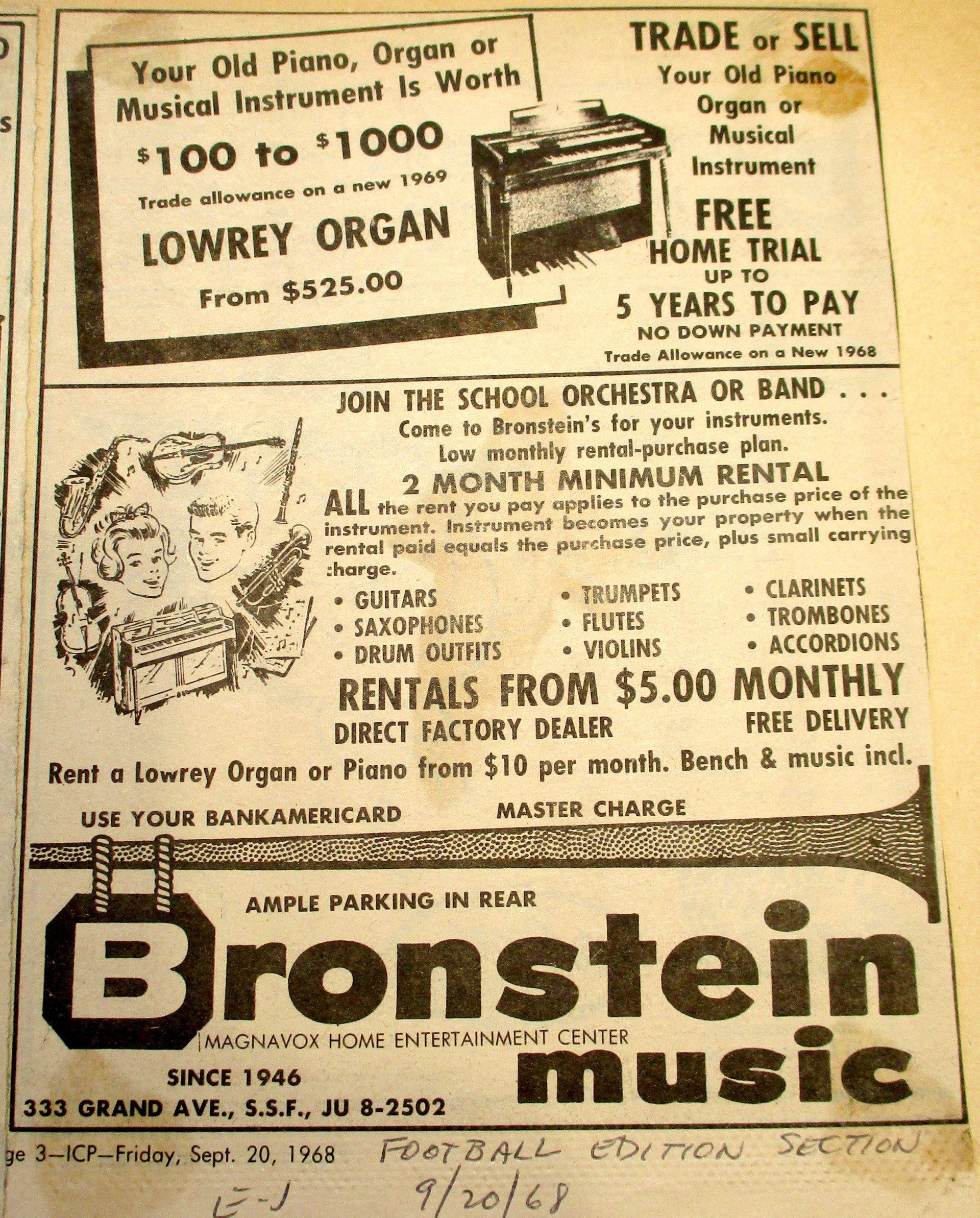 Bronstein Music doesn't sell organs (seriously, it was a lot of organs!) or provide lessons anymore, but we're more focused than ever on school band programs and repairs for the local community. As we did in 1946, we still are dedicated to getting first time players, pros, and the general community quality instruments that will last them a lifetime.